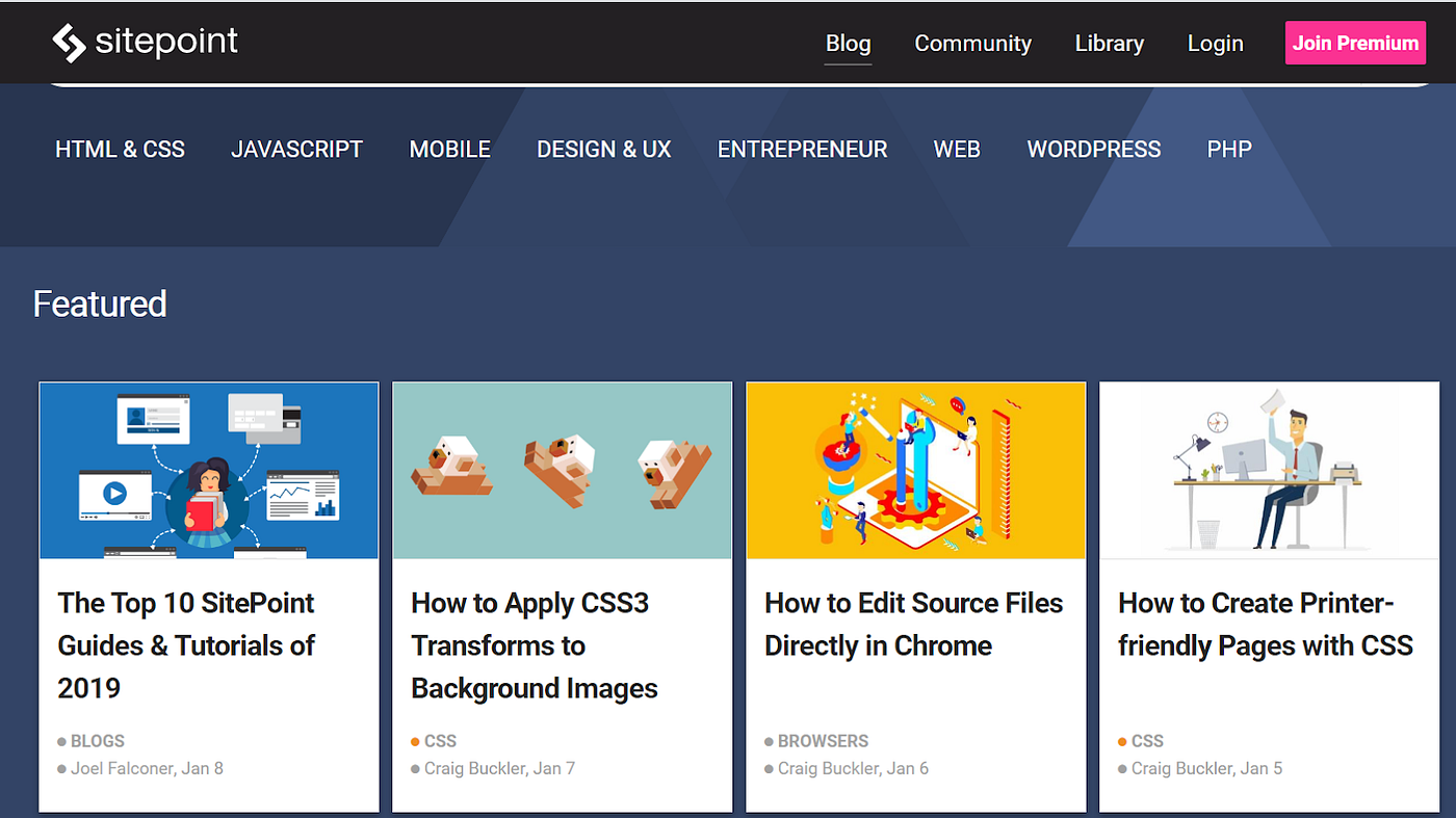 SitePoint is a website that focuses on informative and technical content. Each calendar month they focus on one topic and publish content that gives actionable advice to readers. Their chief focus is on web evolution and analytics.